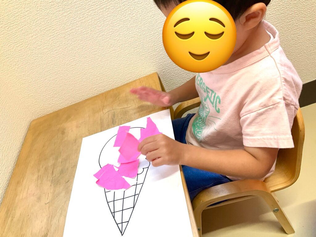 製作の様子です!折り紙をちぎってのりで貼りつけます。