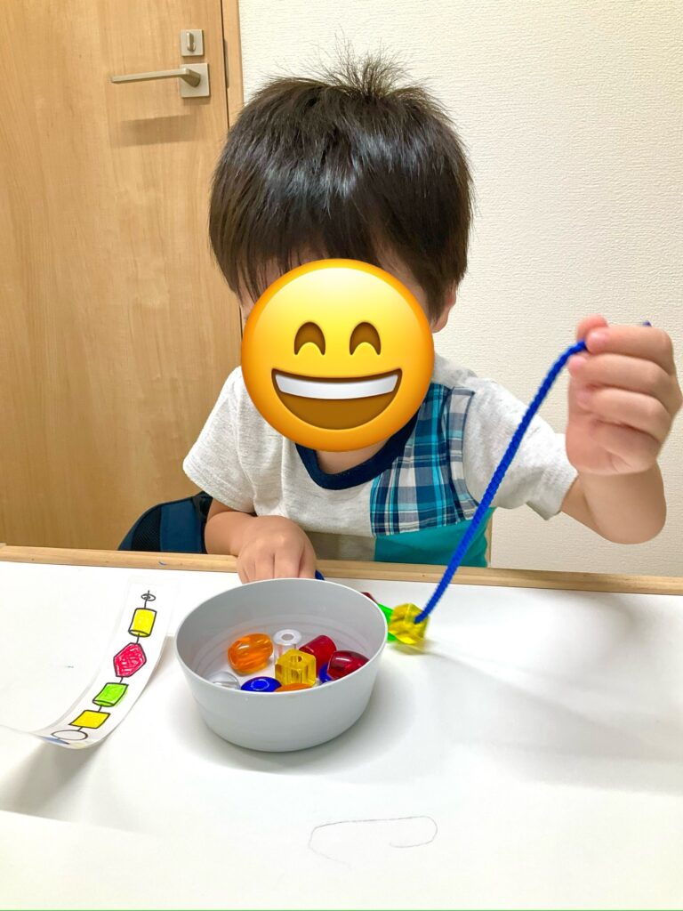 年中のお友達です。ひも通しの模倣を行いました!