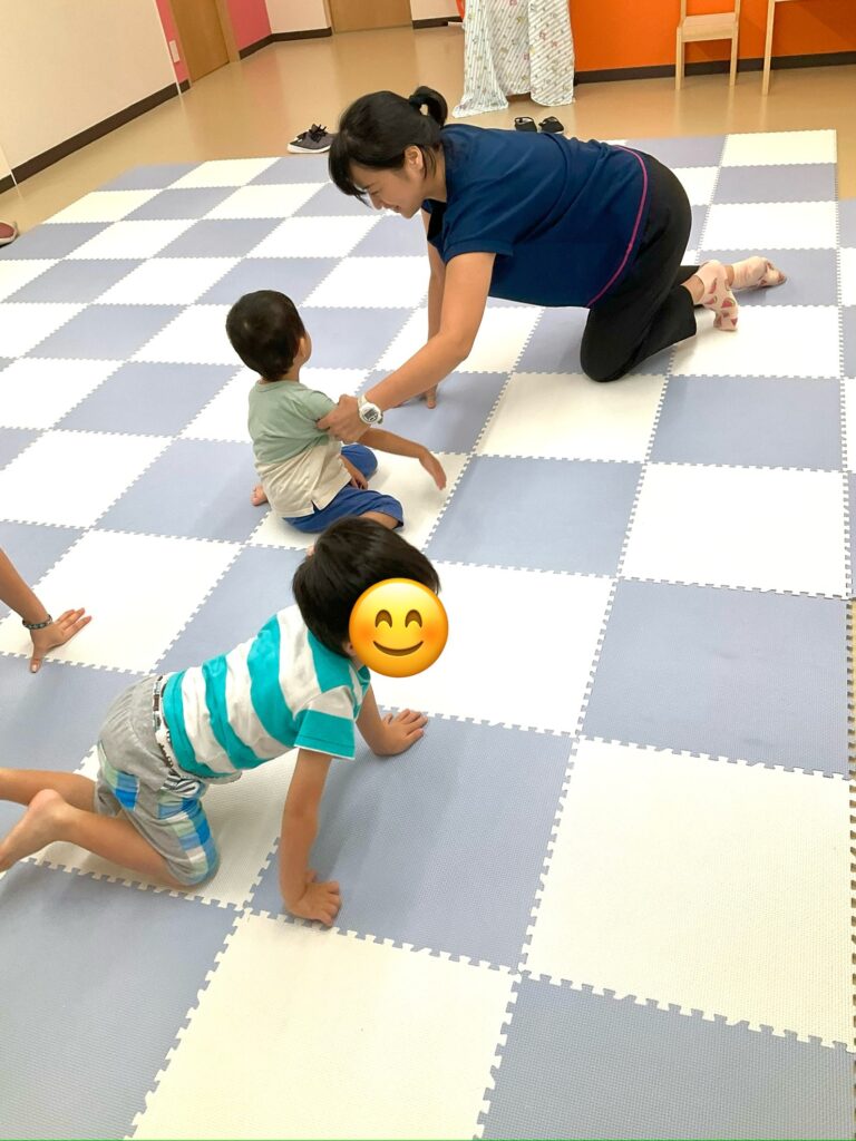 ねこのまねっこをしながら歩いています。ねこの体制になるのが難しいお友だちも、