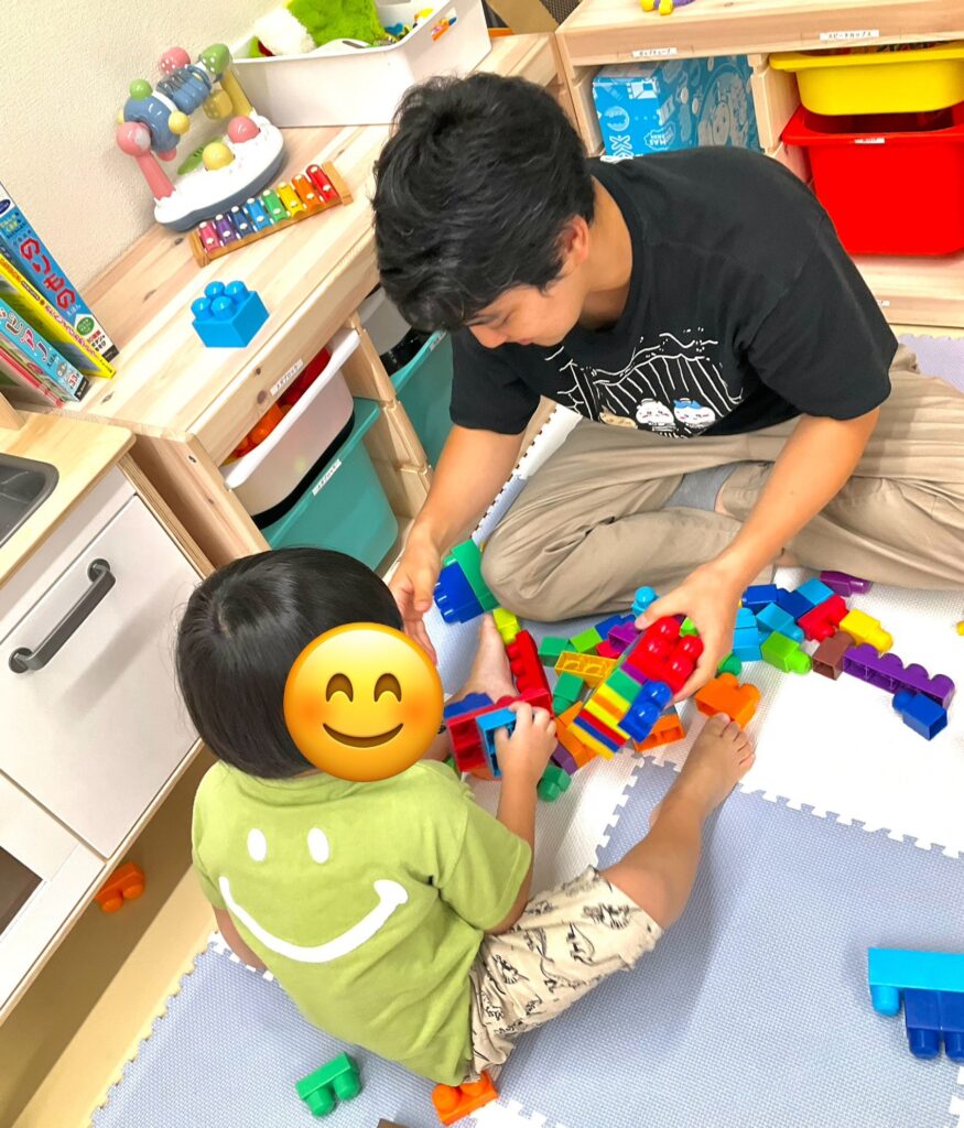 自由遊びで先生と一緒にブロックを組み立てて遊んでいるお友達です♪