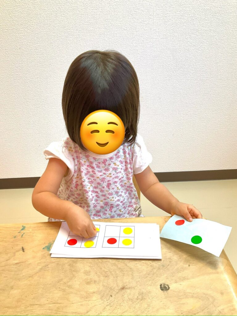 先生は温かく見守りながら、「よく見てね。同じ場所に貼れているかな。ファイト!」と心の中で応援しています☺✨