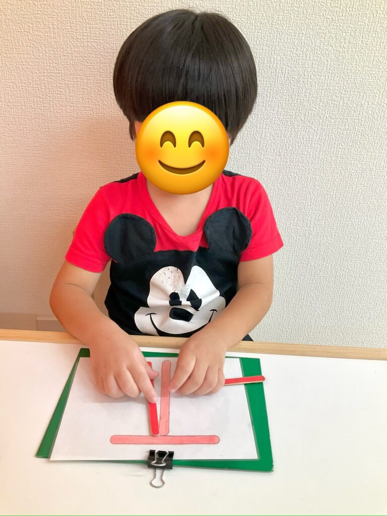 ものの模倣・・★棒模倣 見本を見ながら、時には見本の上に重ねながら同じ形を作ります。