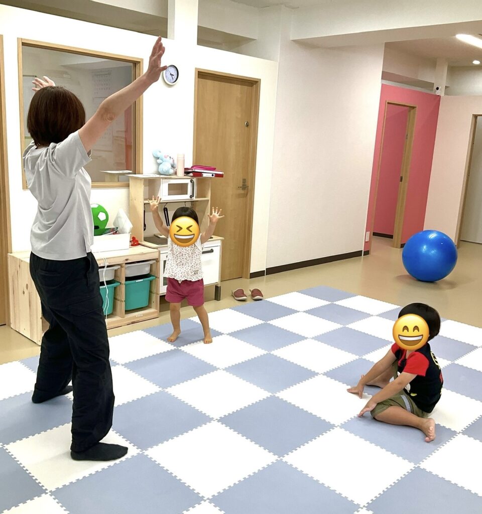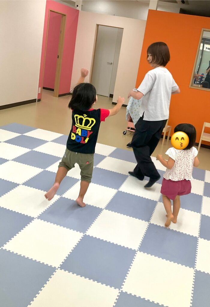 リズムウォークのご様子です。指導員の動きを見て、ニコニコで両手を挙げています!
