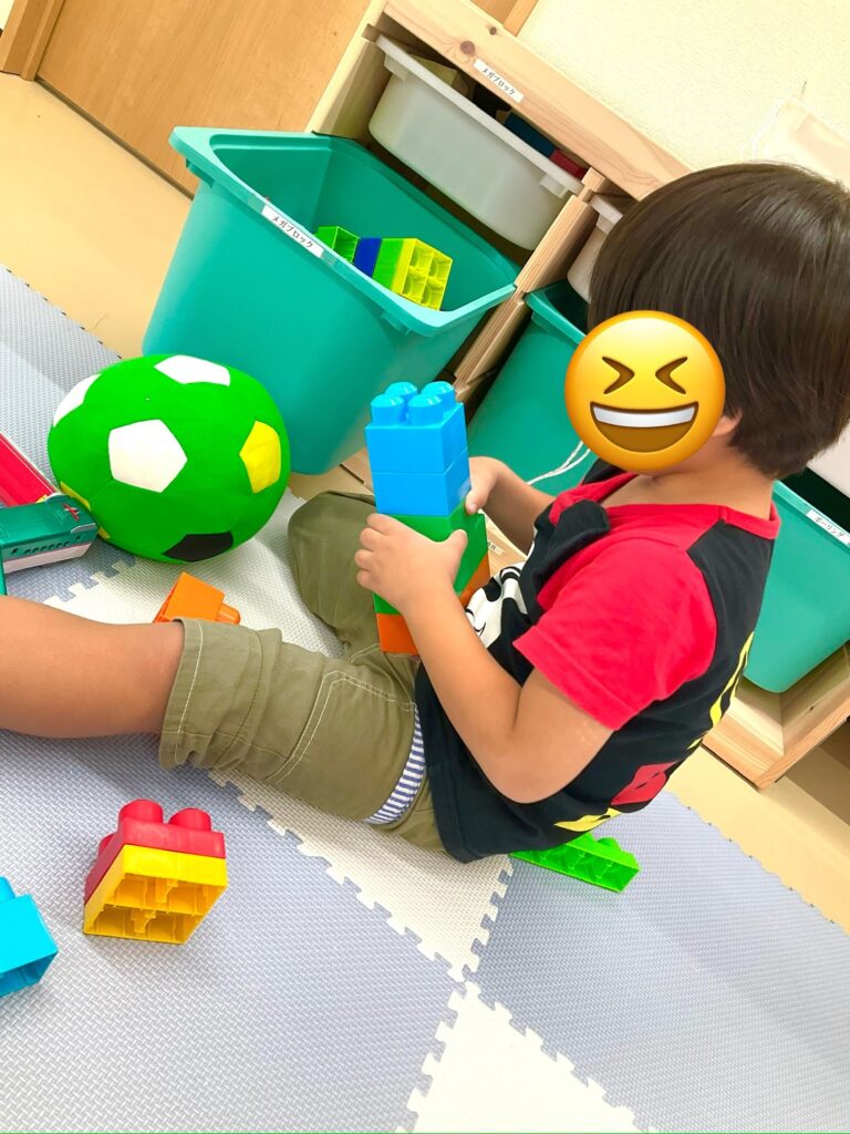 ふわふわクッションボールで遊んだ後は、大きなブロックで遊んでいます。