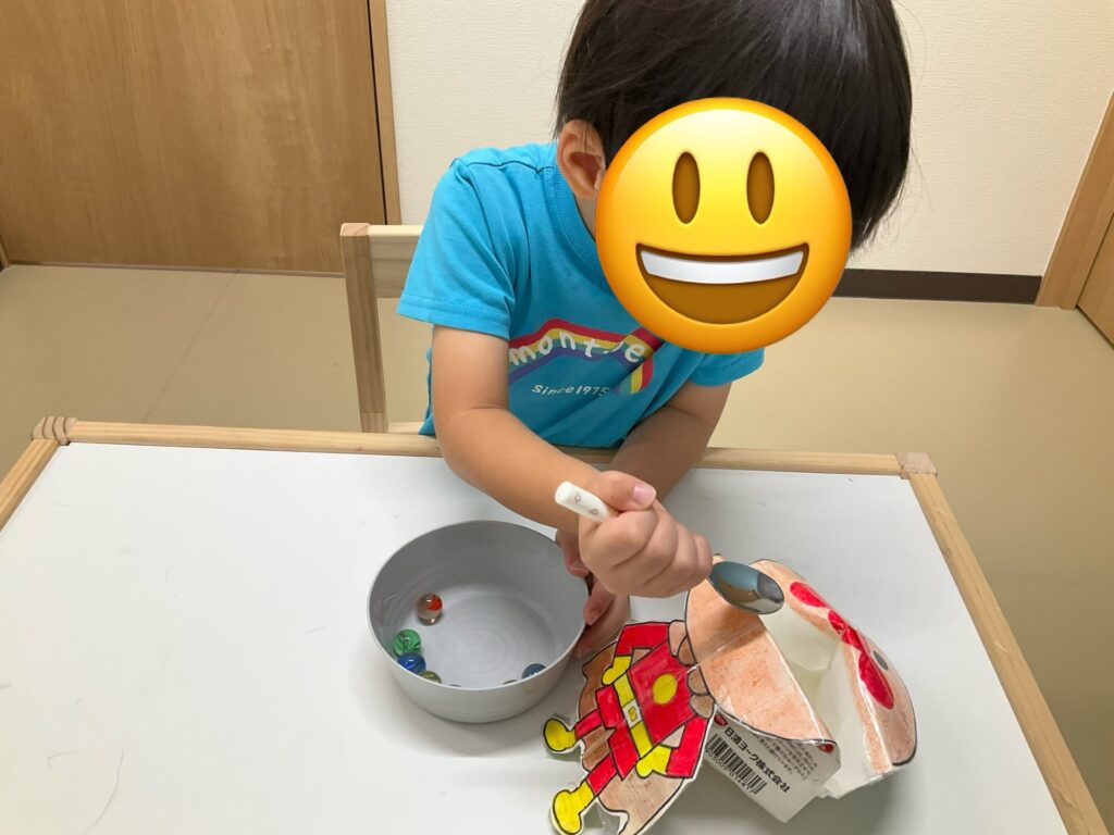 ビー玉をスプーンで運ぶ練習は、アンパンマンにお手伝いしてもらいます。