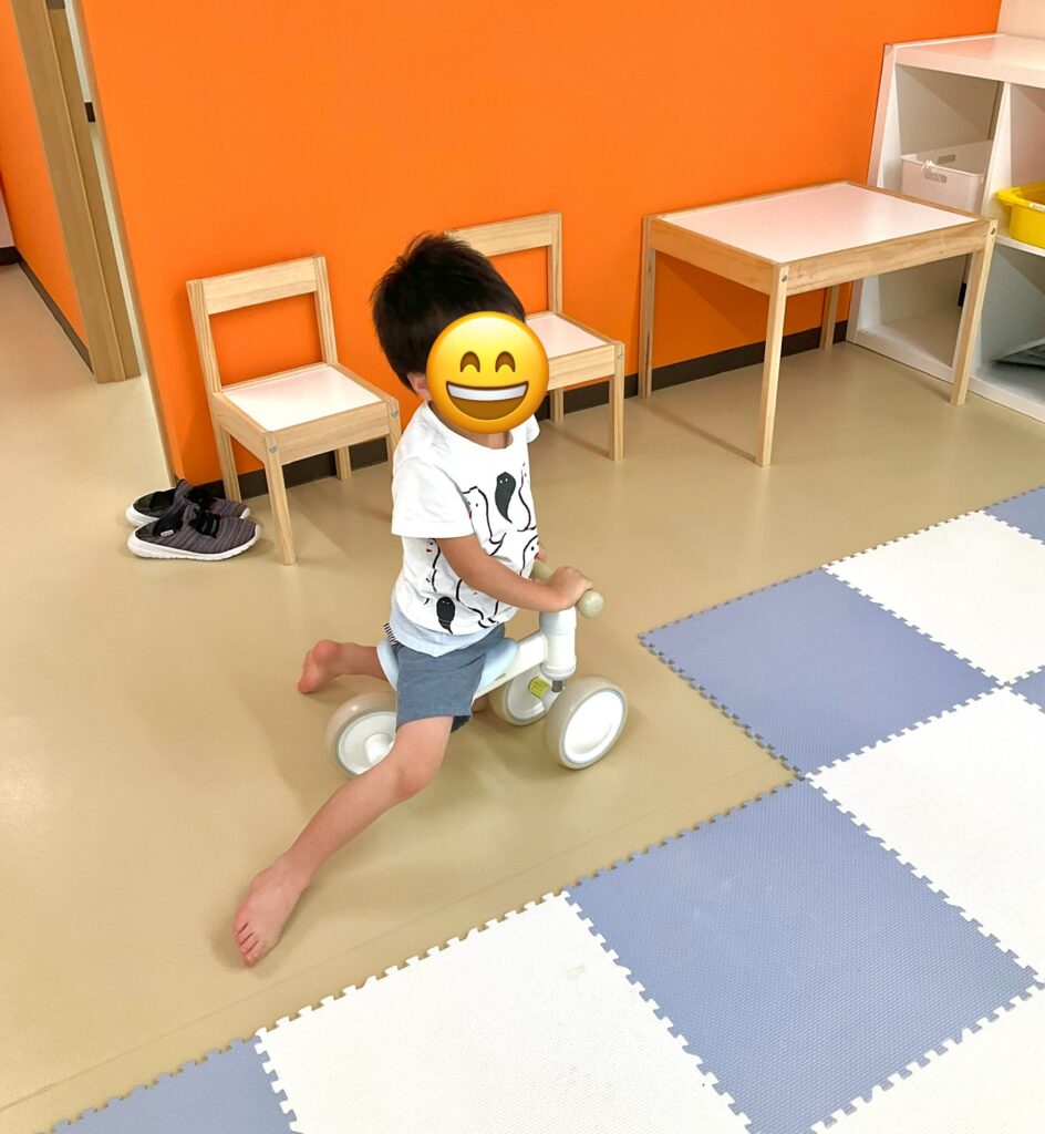 三輪車でどこに行こうかな~??お部屋を見渡して考え中です😊