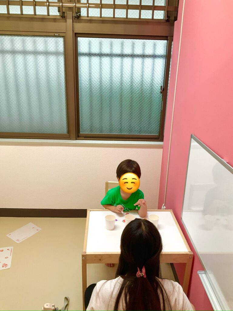 こちらのセラピーでは、分類という課題で、ぶどう、バナナ、りんごを各紙コップに分けています。「りんご~」