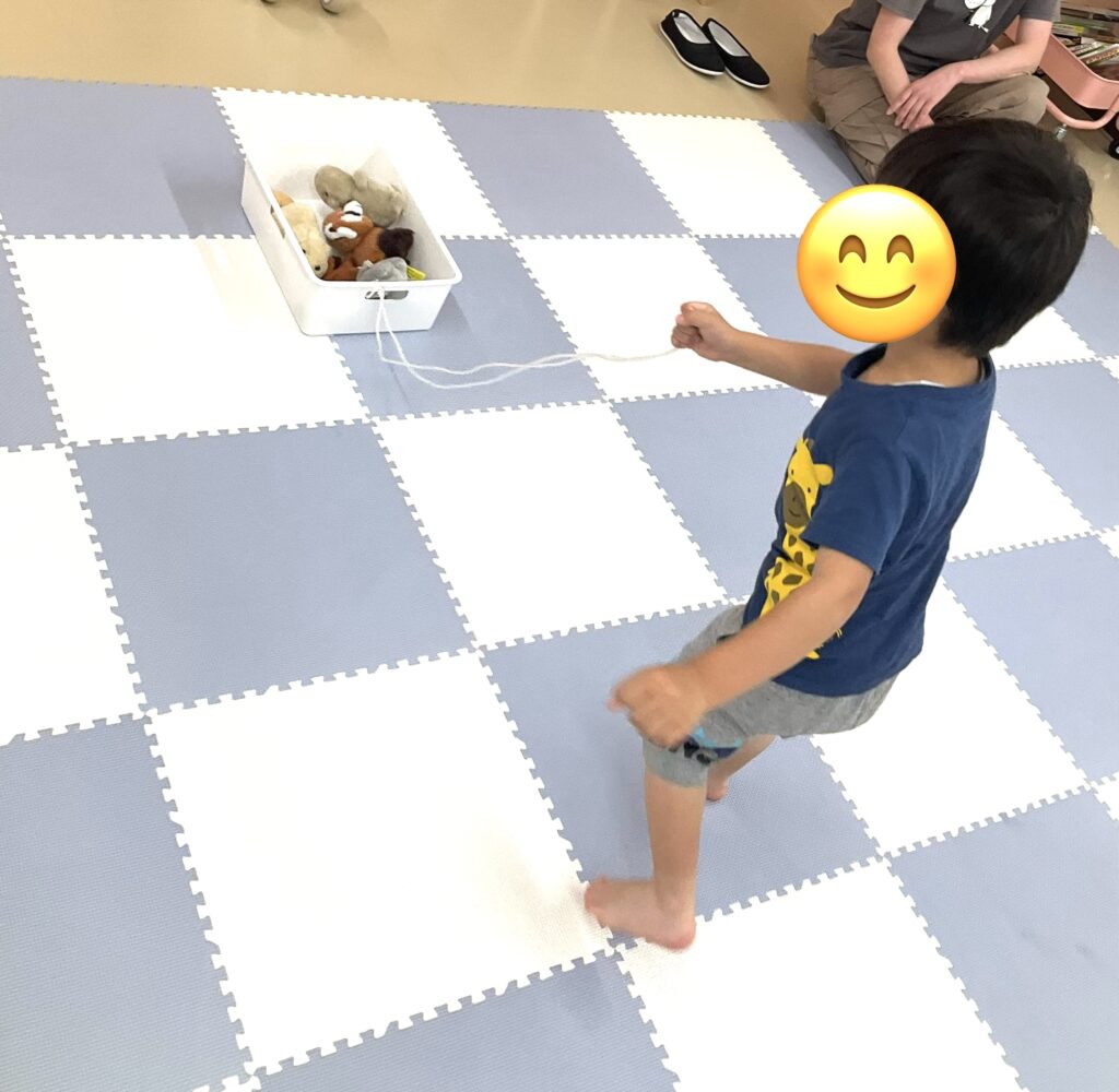 歩いたり、走ったり、動物の模倣をしたり、職員が指示を出しながら進めていきます。