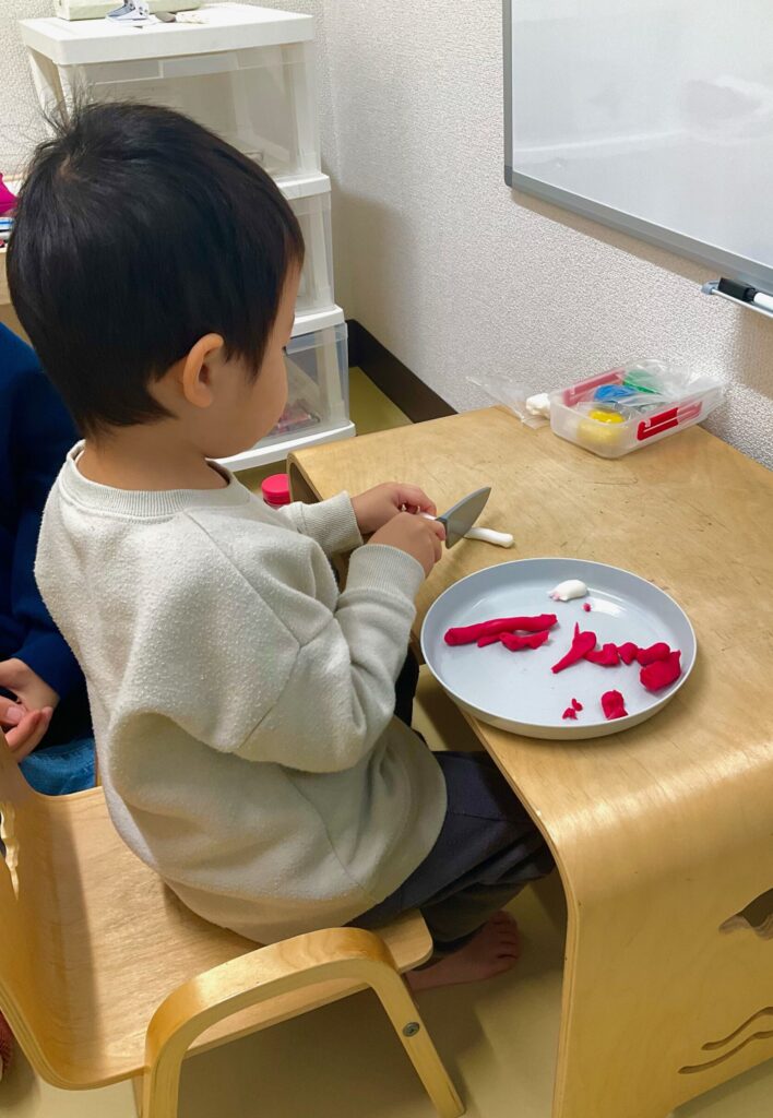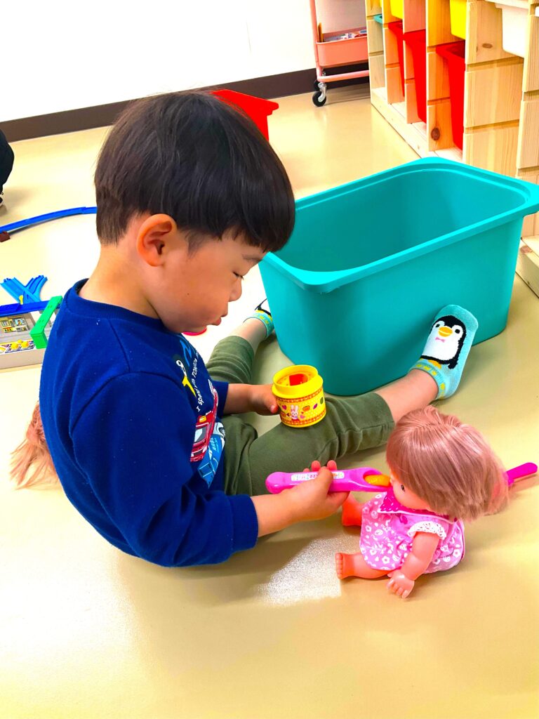 また、メルちゃんにご飯を食べさせてあげたり、おままごとの食べ物を包丁で切っていました。