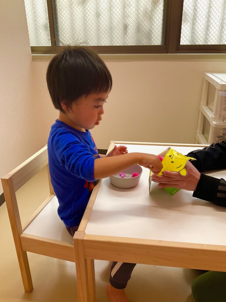 スプーンでポンポンをすくい、プーさんに食べさせてあげています。僕も食べたいな~。
