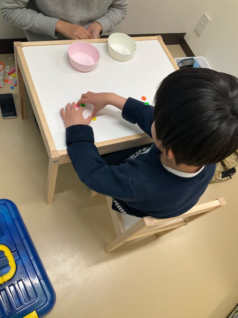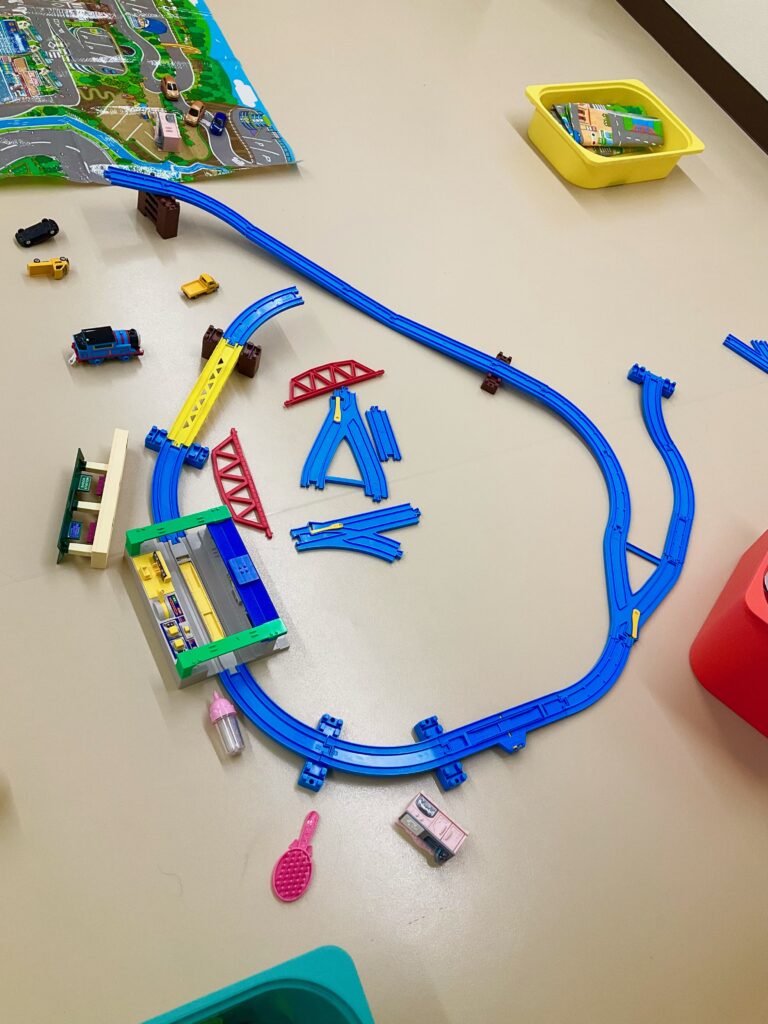 リズムウォークの前の自由遊びでは線路を丸くつなげたり、電車をたくさん走らせていました。