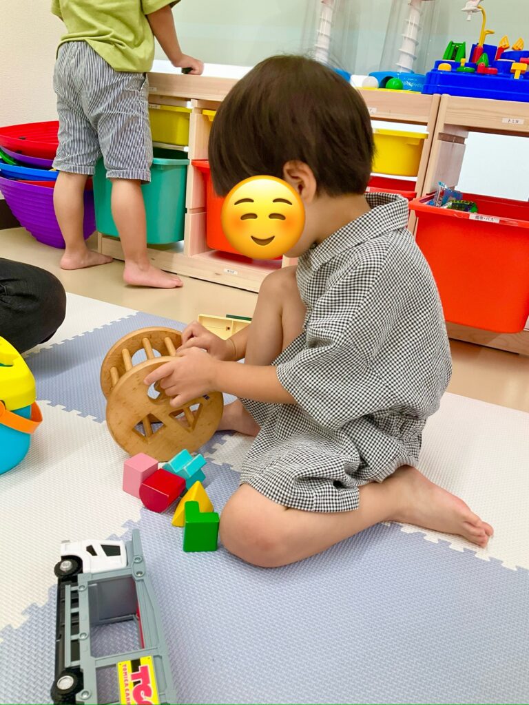 木製のいろいろな形のつみきを型にはめるのに、つみきを出しているところです♪出すところがよくわかっていますね👏