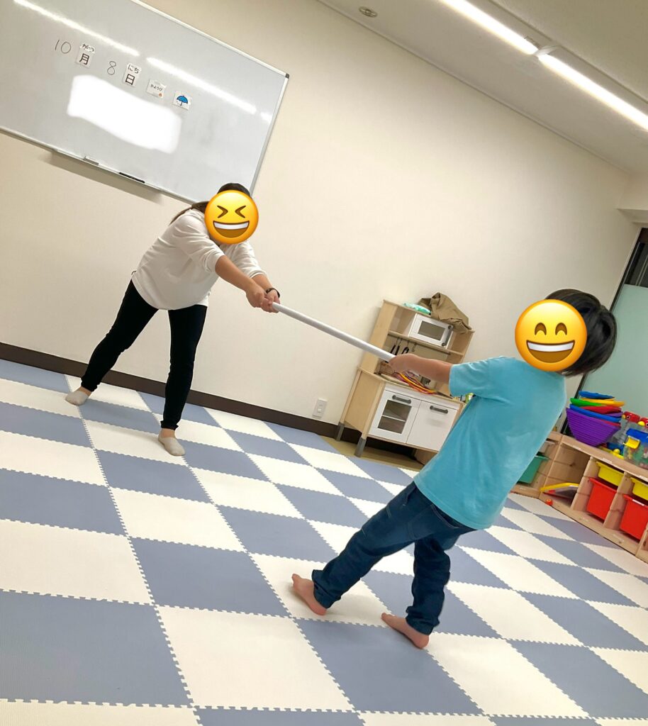 最後のお友達は、先生と一緒にとげとげクッションを触っています😊