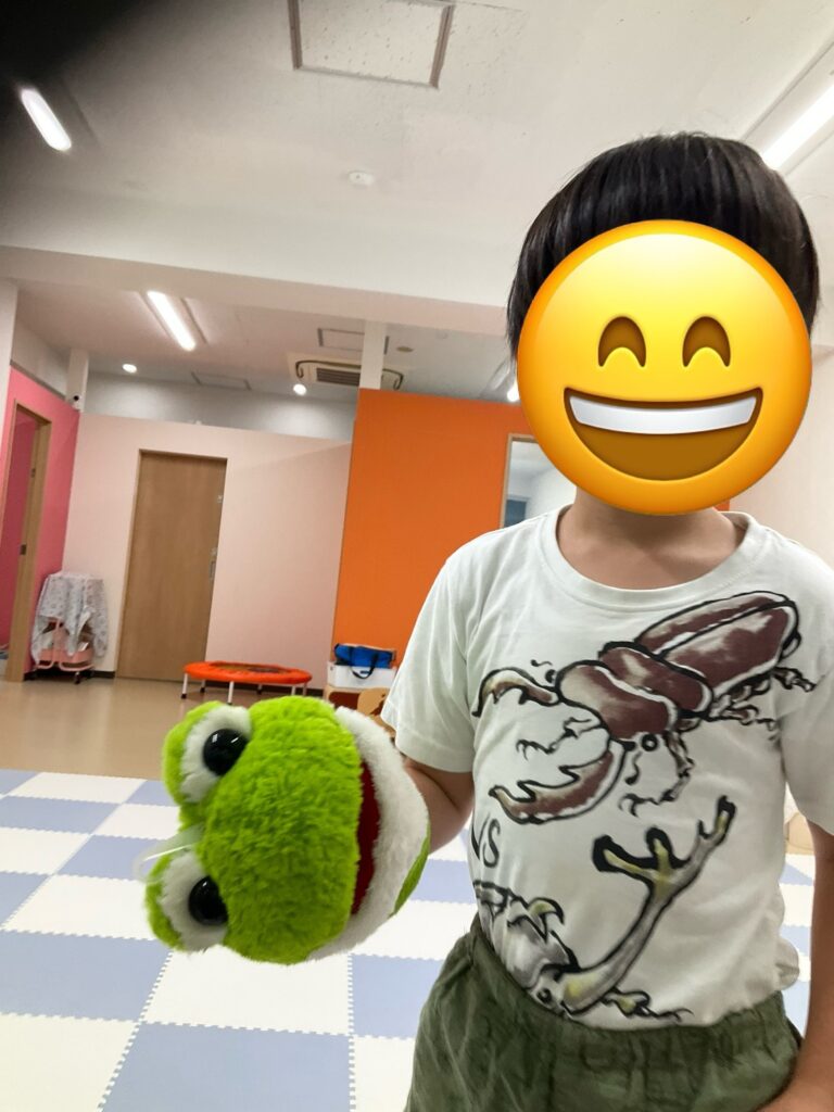 「カエルだぞ~!」手にカエルをつけて歩き回るお友達!!