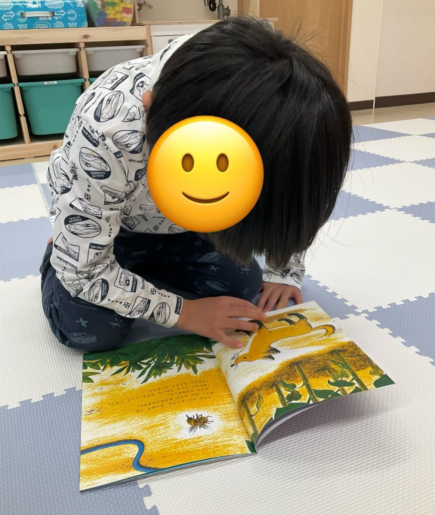 フリープレイでは年長さんが絵本を音読していました。読めるひらがなが増えましたね。