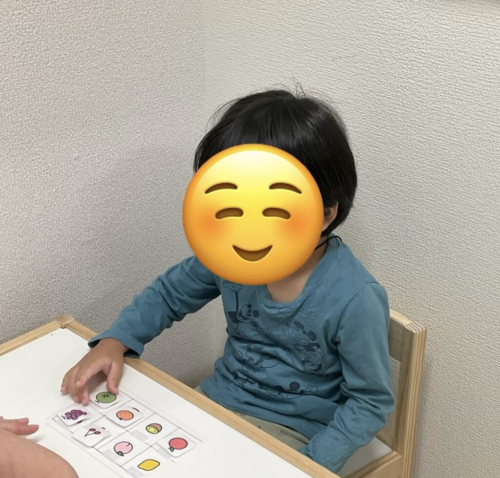 果物のマッチングです。よく見比べています。この後、形と食べ物のマッチングも頑張りましたね。