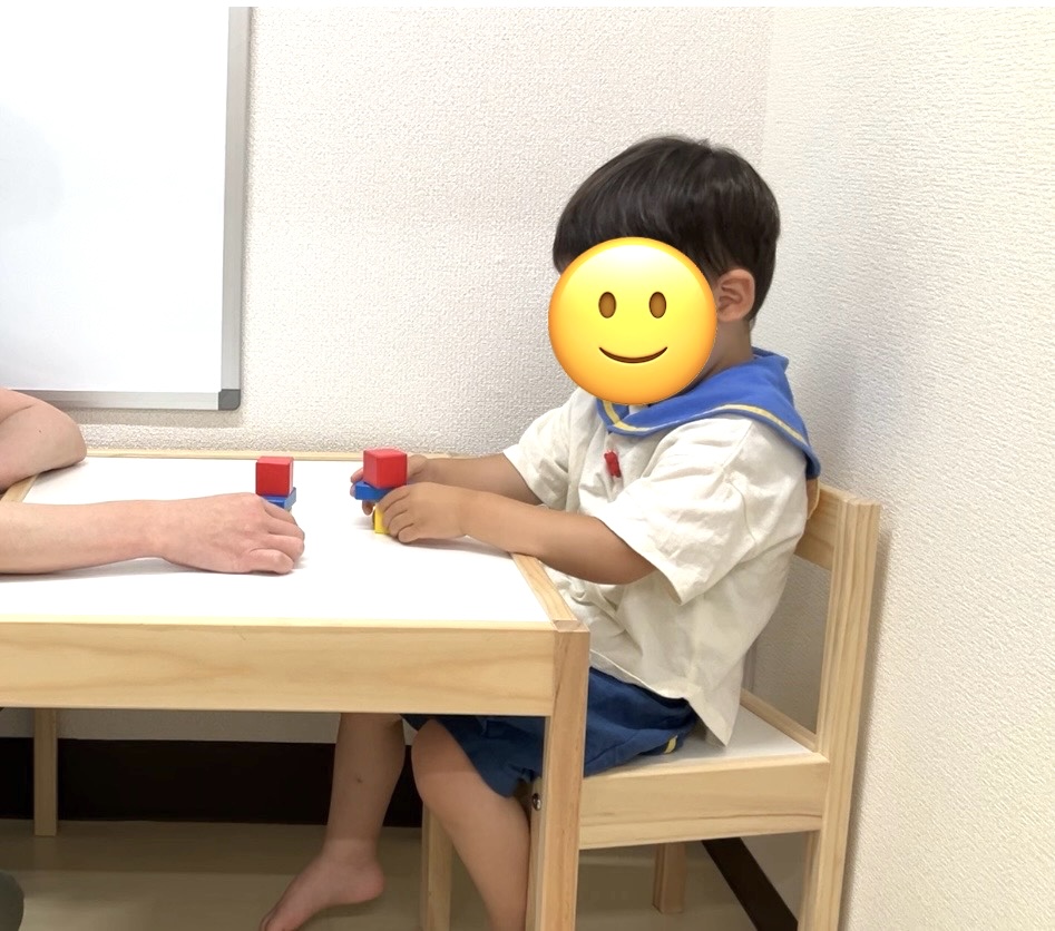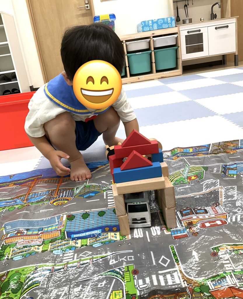 積み木模倣。形と色をよく見て同じにできていますね!上手です!