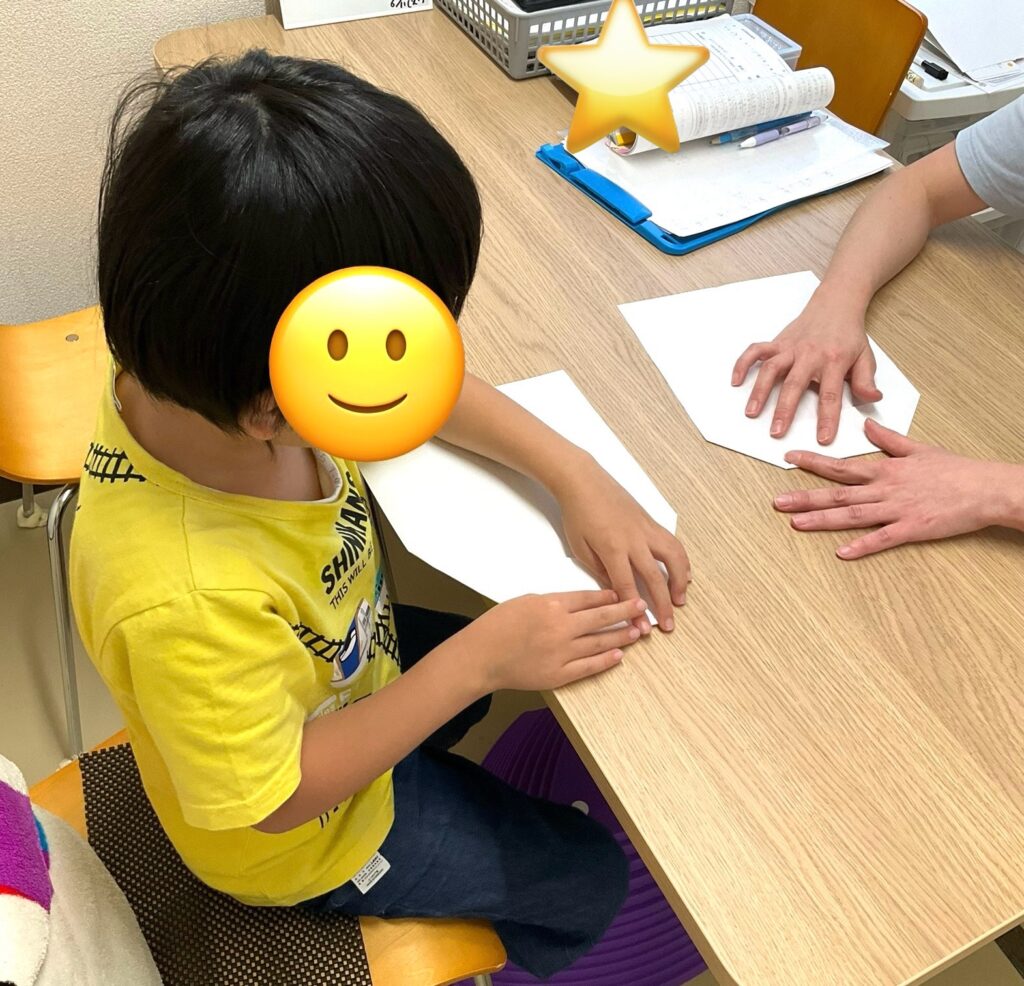 紙飛行機を作っています。先生と一緒に1工程ずつ上手に折っていますね。
