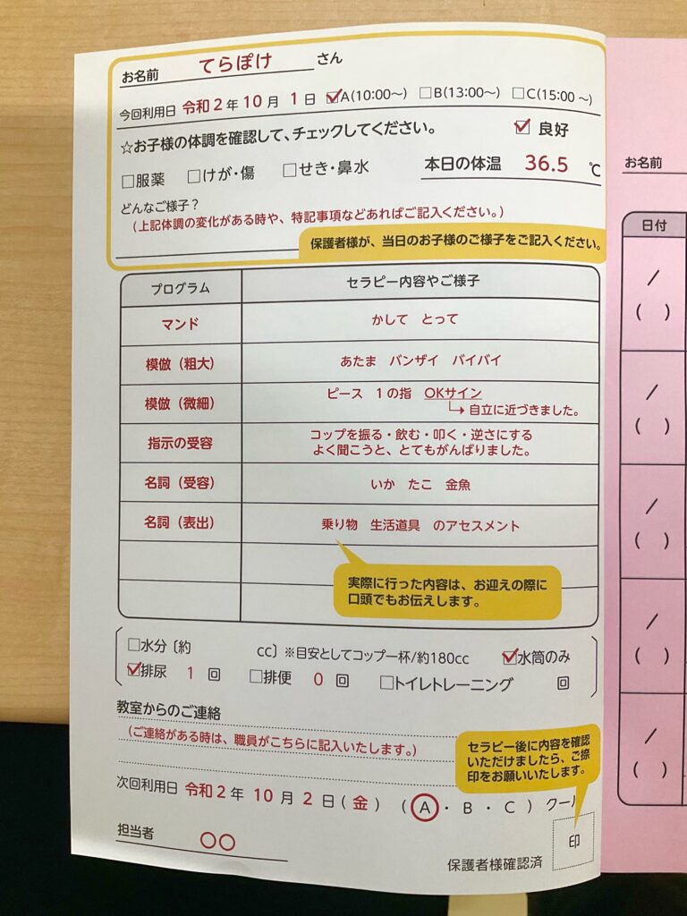 また、次回の利用日や担当の職員の名前を記入しています。