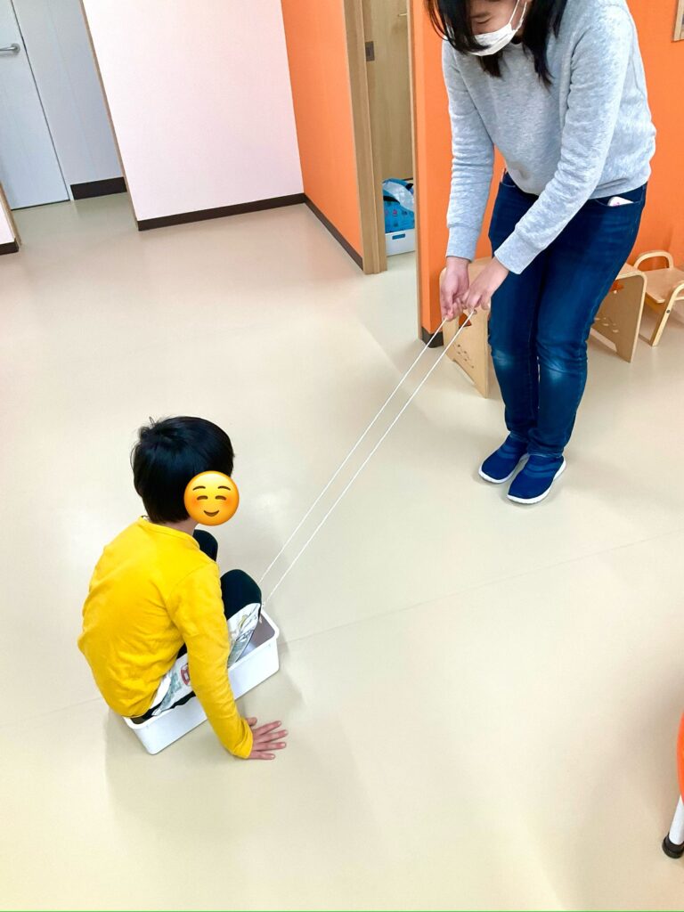 自由時間では、かごに入って電車ごっこをしているお友達や、先生にくすぐり攻撃をされながら