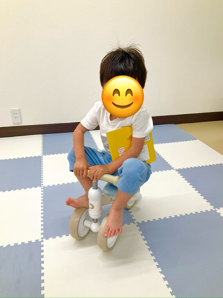 絵本を持ちながら三輪車に乗っています!タイヤに足をかけてこごうとしているのかな?