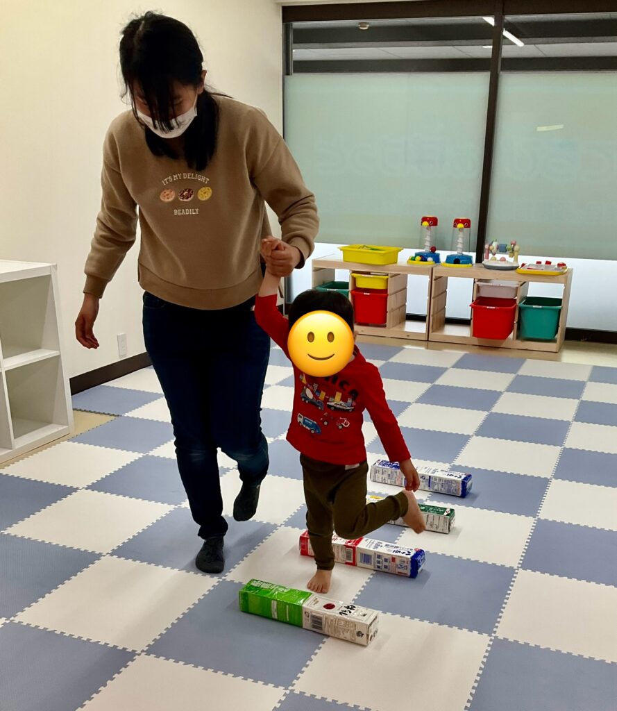 職員と手をつなぎながら、牛乳パックをまたいでいます!