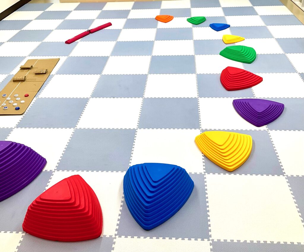 運動の時間はバランスストーンや平均台を配置してサーキットで行いました。
