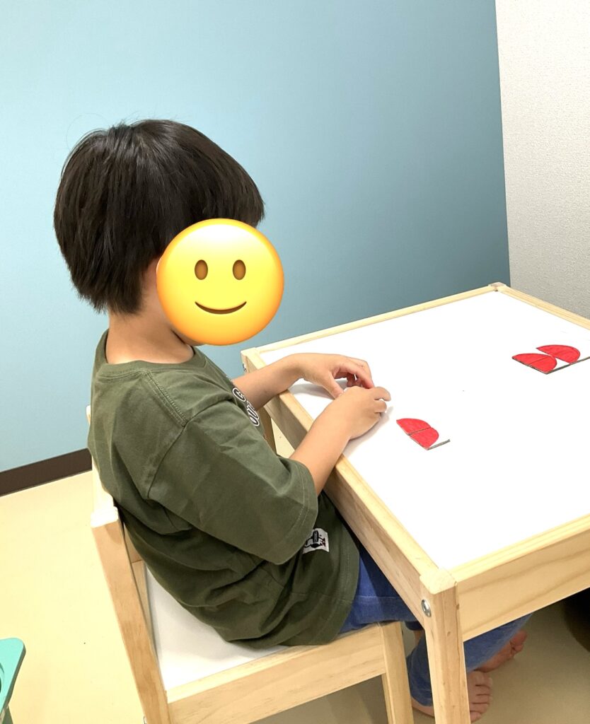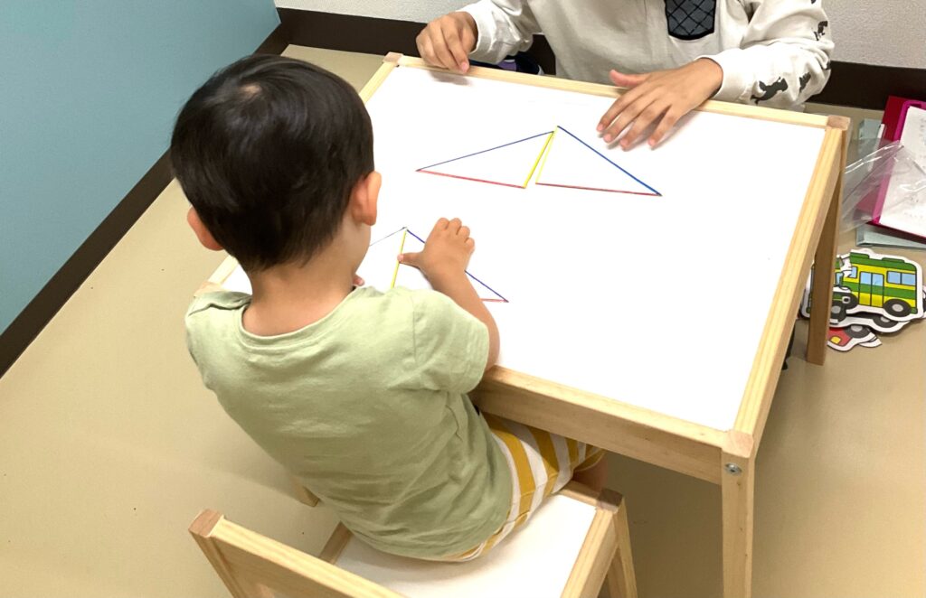 はじめに図形の模倣となります。四枚の形を使い、見本と同じものを完成させました♪